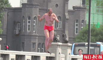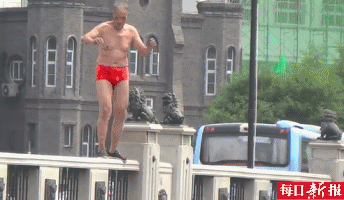 市民杨先生拍到了让人惊叹的一幕,一名老年人仅穿着一条红色短裤,在不足20厘米宽的狮子林桥桥膀子上来回走动,走动距离达数十米远。经过小狮子时,大爷附下身子双手扶着小狮子慢慢挪过。大爷这是在做入水前的热身动作。