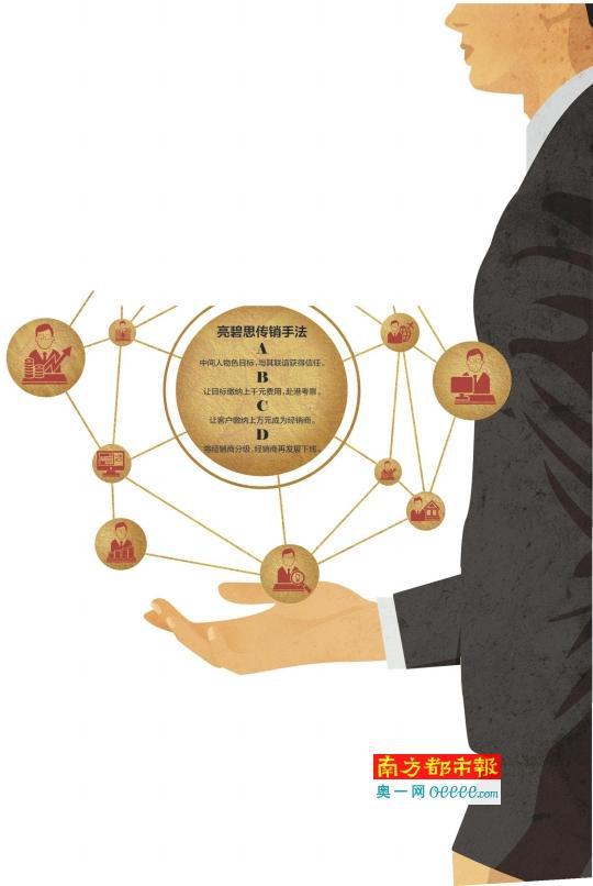 据悉,亮碧思拉人入伙采用A BP联谊、邀约模式。A是顾问、讲师,B是桥梁、中间人,P是客户、受害人。在开始业务时,第一步就是与客户联谊。中间人将物色目标对准一些感情、事业、家庭受过挫折,或不甘于现状,希望快速致富的人。通过对其形象、气质进行改造后,主动关心,让对方感受温暖和安全感,再收集对方的家庭、职业、理想等个人信息,随即开始下手。