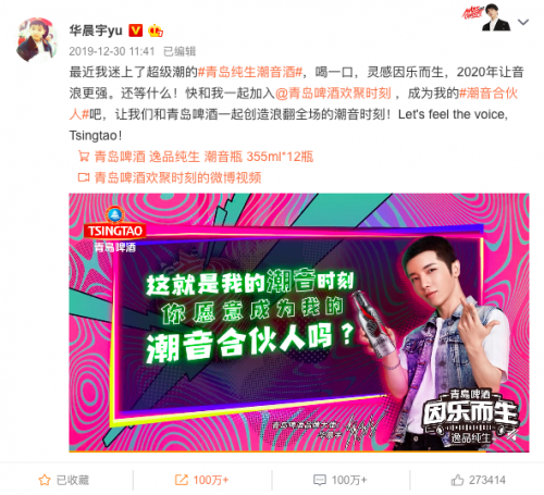值得一提的是,作为啤酒届的时尚“鲜”生,青岛纯生在跨年夜专为喜爱潮流音乐的年轻人送上了一份惊喜大礼:发布由“花花”华晨宇代言的音乐主题“潮音酒”。