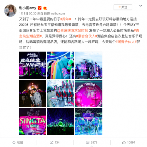 众多微博时尚达人,积极响应“花花”华晨宇的号召纷纷加入“潮音合伙人”阵营,更有甚者现身ISY三亚国际音乐节现场,他们跟随电音的躁动节拍,在“潮音合伙人”潮音集合店玩“啤”拍照,安利打call。知名音乐博主“潮音乐”、 “BOOZ音乐”等在转播ISY三亚国际音乐节电音盛况的同时,也都提及此次音乐节上的亮点——青岛啤酒“潮音酒”震撼发布,在微博又掀起一波“潮音合伙人”热潮。