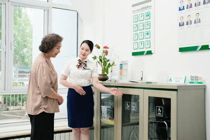 图:柜面服务人员为老年客户介绍适老化服务设施