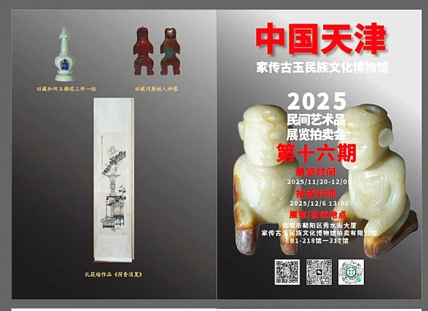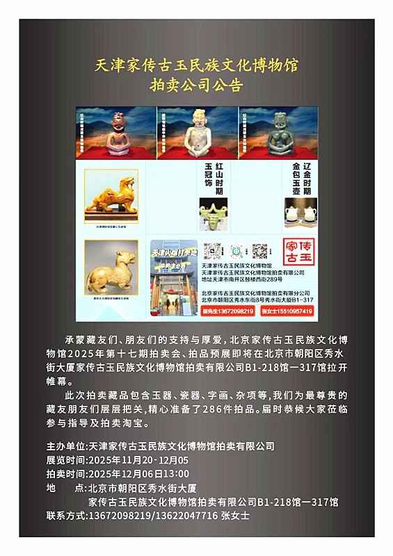 头条新闻讯 (李兆祥 报道) 11月17日,天津家传古玉民族文化博物馆拍卖有限公司近日宣布,将于2025年12月在北京举办一场盛大的民间艺术品拍卖会。预展活动定于11月20日至12月5日举行,正式拍卖会则安排在12月6日星期六下午1点开槌。活动地点位于北京市朝阳区秀水街大厦的家传古玉民族文化博物馆拍卖有限公司B1-218馆至317馆。此次拍卖会面向广大藏友和艺术爱好者开放,支持线上线下同步竞拍,预展期间还将提供交流鉴赏和洽谈服务。