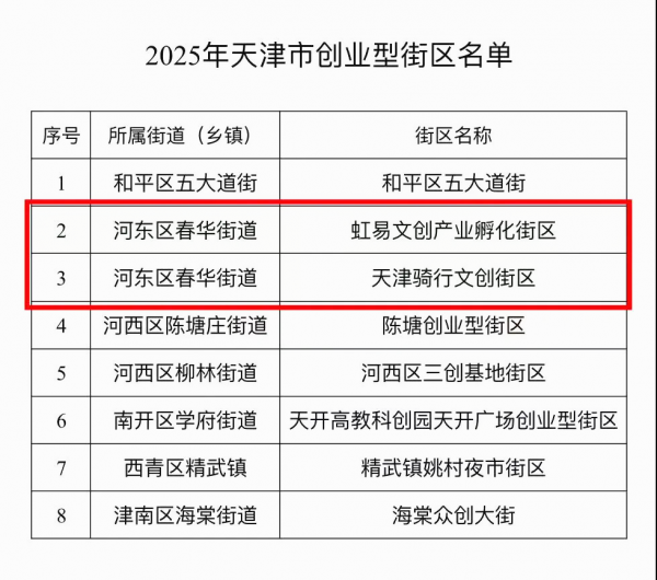 头条新闻讯 近日,2025年天津市创业型街区名单公布,全市8个街区上榜。河东区2个上榜街区均属春华街道,分别为虹易文创产业孵化街区、天津骑行文创街区,彰显了春华街道培育特色创业载体、激发经济活力的成效。