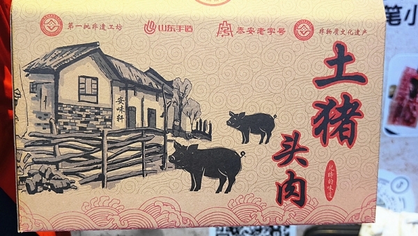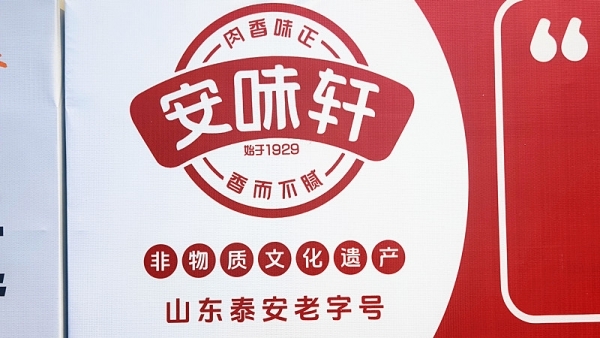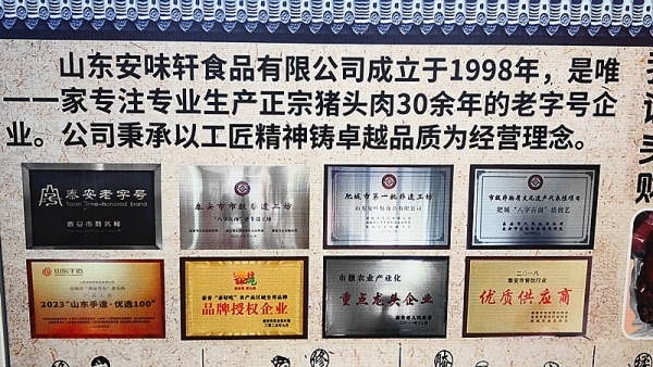 安兴强首先拿起一盒经典的“酱卤猪头肉”,产品外观呈现自然的酱红色,色泽诱人。他向大家介绍,安味轩始于1998年,扎根于有着“肥桃之乡”美誉的肥城市。公司传承的核心技艺——“八字古卤”,已经成功被列为非物质文化遗产,这不仅是工艺,更是几代人智慧的结晶。他提到,正是这份深厚的文化底蕴和品牌沉淀,让安味轩荣获了“山东手造优选100品牌”“泰安市老字号”等称号,并被载入地方史志名录。