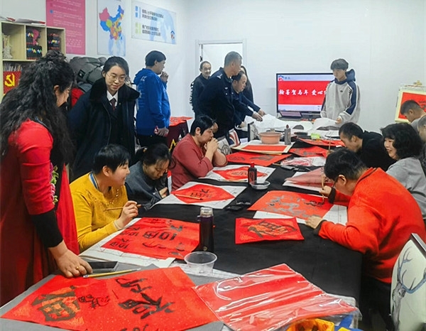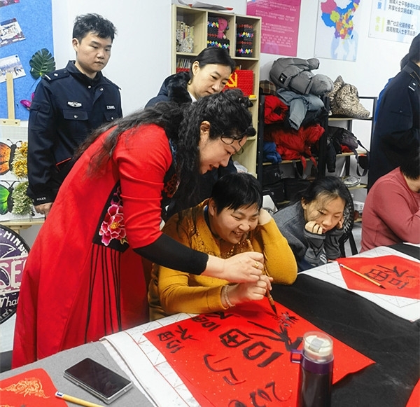 活动现场喜气洋洋,红纸铺展,翰墨飘香。南开区人民检察院法警队队长姚志捷、南开区关心下一代工作委员会代表刁智及部分检察干警,与天津盛林钛环保科技有限公司的员工代表孙斌、翟瑾、孙兰华、陈金亮、张羽鸣、孙晨翔等人齐聚一堂。他们与慧灵服务中心的学员们亲切互动,手把手地教授书写“福”字和春联。一笔一划间,传递的不仅是传统文化的韵味,更是社会大家庭的温暖与鼓励。学员们兴致勃勃地体验着迎春纳福的乐趣,现场欢声笑语不断,洋溢着浓厚的节日氛围。